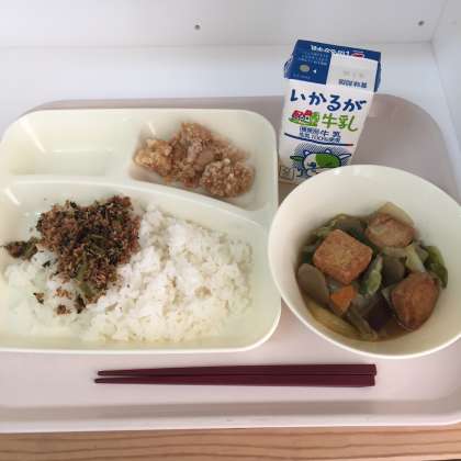 今日の献立は、ご飯、牛乳、鶏肉のたつた揚げ、厚揚げと野菜の煮物、おかかなっ葉でした。