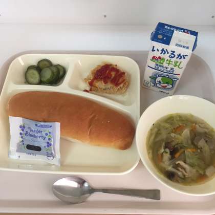 今日の献立は、コッペパン、ブルーベリージャム、牛乳、ツナポテトオムレツ、スープ、きゅうりのバジル風味サラダでした。