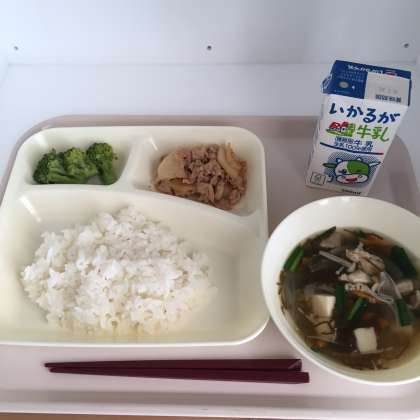 今日の献立は、ご飯、牛乳、豚肉のコチジャンいため、もずくスープ、ブロッコリーのナムル風あえものでした。