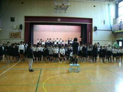 今日は児童朝会の後、今週土曜日(17日)に開催される学習発表会の全体練習2回目を行いました。今日は、1年生が舞台に立ち、他の学年はフロアで、全体合唱の練習をしました。各学年、練習にも気合が入ってきました。講堂の設営もできました。本番が近付いてきました。