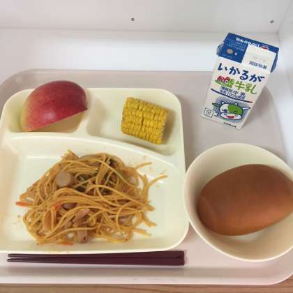 今日の献立は、黒糖パン、牛乳、チキントマトスパゲッティ、焼きとうもろこし、りんごでした。