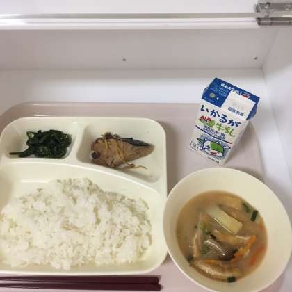 今日の献立は、ご飯、牛乳、なまりぶしのしょうが煮、みそ汁、ほうれん草のごまあえでした。