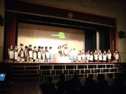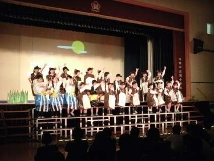 開会の前に「ふくちゃんズ」から、観劇のマナーなど、諸注意があり、児童会からの開会の言葉でスタート。全員で「地球星歌〜笑顔のために〜」を合唱しました。そして、プログラム1番、歌や踊りの好きな1年生による劇「たぬきばやし」がありました。とてもかわいいらしい「たぬきリズム」はいかがでしたでしょうか。