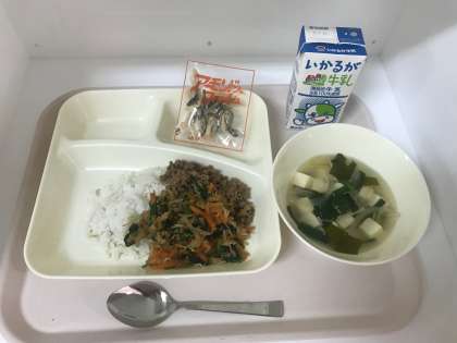 今日の献立は、牛乳、ビビンバ、わかめスープ、アーモンドフィッシュでした。