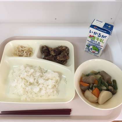 今日の献立は、ご飯、牛乳、くじらのたつたあげ、さといもと野菜の煮物、もやしのゆずの香あえでした。