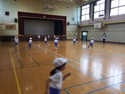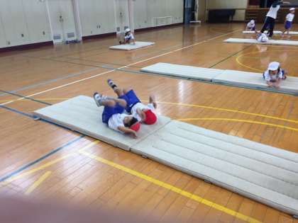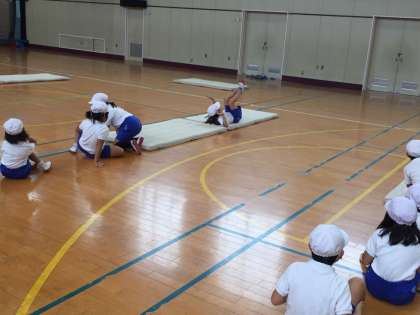 1年生の体育の授業の様子です。講堂で、ウォームアップで鬼ごっこをした後、マット運動をしました。上手に前まわりをしています。苦手な子は、横になって転がっています。かわいらしい中にも、子どもたちの表情は真剣です。