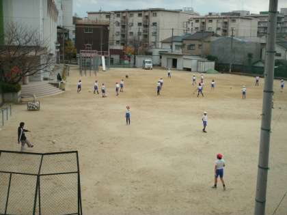 5年生の体育の様子です。サッカーを学習しています。今日はパスワークの練習です。男子も女子も仲良く練習しています。