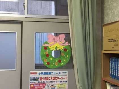 毎週火曜日は、図書室に支援員の先生が来られています。今日も、1年生に読み聞かせを行ってくださいました。いつもありがとうございます。また、ボランティア「ハッピーブックちゃん」の皆さんには、図書室の飾りつけをしてくださっています。とてもかわいいクリスマス仕様です。