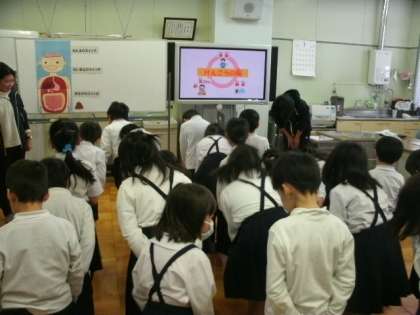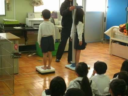 二測定2日めです。今日は5年生、3年生、1年生の順番で行われました。写真は1年生の様子です。みんなで協力して、22人が身長、体重を7分で計り終わりました。素晴らしい!その後、紙芝居「よふかしおにはやねちゃん」を観ました。養護教諭から「はやね」「はやおき」「あさごはん」の大切さ、栄養教諭からご飯を食べることで入る3つのスイッチのことを話してもらいました。1年生は話の区切りごとに、騒がしなります。体内の話の時に、あるモノが登場した時、「キャー!」と悲鳴が上がりました。大人には新鮮な反応でした。今日で6学年すべて測定が終わりました。半年経って、どれだけ大きくなっていましたか?