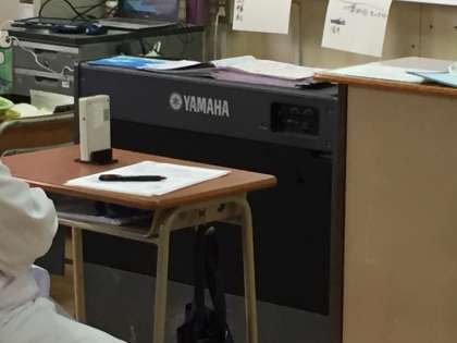 今日は、学校薬剤師の先生が来られ、教室の中の空気がどれだけきれいか確認をしていただきました。本校の中で一番子どもの数が多い2年生ど行われました。