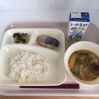 今日の献立は、ご飯、牛乳、さごしのしょうゆだれかけ、みそ汁、みずなの煮びたしでした。