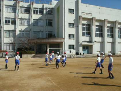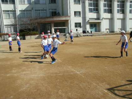 5年生、4時間目の体育の授業の様子です。サッカーの授業です。男の子も女の子も元気にボールを追いかけています。