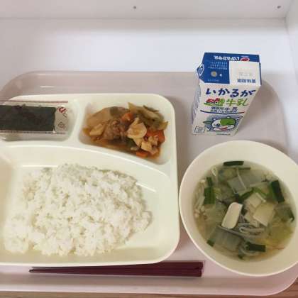 今日の献立は、ご飯、牛乳、酢豚、ワンタンの皮のスープ、焼きのりでした。