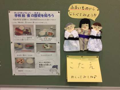 今日、1月24日は給食記念日です。日本の学校給食は明治22年(1889年)に山形県鶴岡市で始まり、全国に広まりました。戦争により中断されましたが、戦後、日本の子どもたちの栄養状態の悪化や食糧不足から世界各国から食料の支援が届けられ、学校給食が復活しました。本来であれば12月24日が給食記念日なのですが、ほとんどの学校が冬期休暇に入っているので、1か月遅らせた1月24日が給食記念日となりました。本校の給食室前の掲示板には、栄養教諭が作った学校給食の歴史をまとめたものを掲示しています。