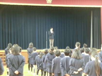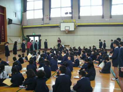 今日の児童朝会の様子です。校長先生から、2日(土)に行われた「かけあし大会」について、「とても頑張りました。地域の方からも褒めていただきましたし、保護者の方もたくさん応援にきてくださいました。」とお話していただきました。