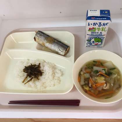 今日の献立は、ご飯、牛乳、さんまのみぞれかけ、すまし汁、茎わかめの佃煮でした。