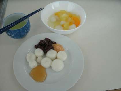 お団子は、自分たちで粉からこねて、湯通ししています。もちもちにゆであがった団子に自分たちのお好みであんこやきな粉や蜜、フルーツをかけました。お団子にあんこやきな粉、蜜にフルーツのシロップがしっかりからみ、程よい甘さでおいしくいただくことができました。