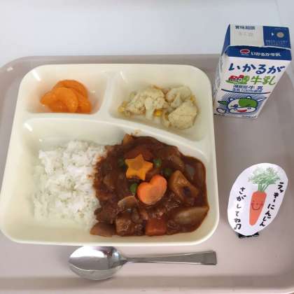 今日の献立は、牛乳、ハヤシライス、カリフラワーとコーンのサラダ、みかんの缶詰でした。