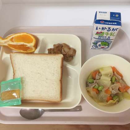 今日の献立は、食パン、りんごジャム、牛乳、鶏肉のみそバターソース、スープ煮、デコポンでした。