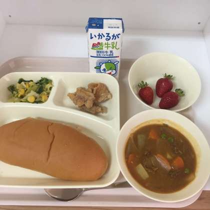 今日の献立は、黒糖パン、牛乳、フライドチキン、カレーシチュー、春のカラフルソテー、いちごでした。