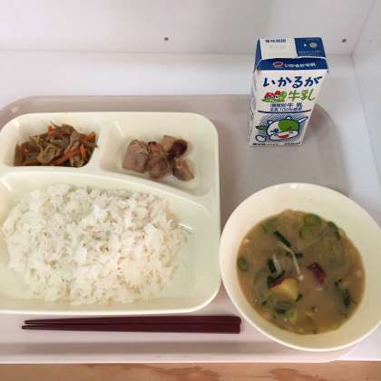 今日の献立は、ご飯、牛乳、鶏肉の照り焼き、さつまいものみそ汁、きんぴらごぼうでした。
