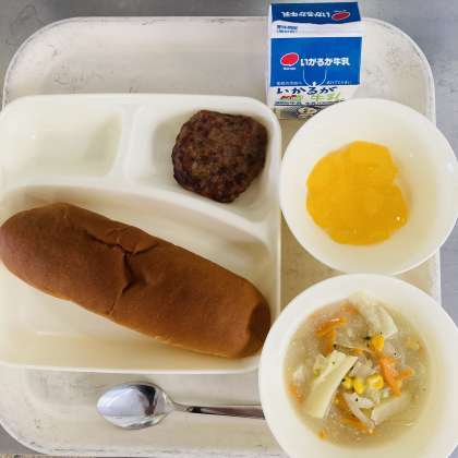 今日の献立は、黒糖パン、牛乳、焼きハンバーグ、豆乳スープ、ダイスゼリー(みかん)でした。