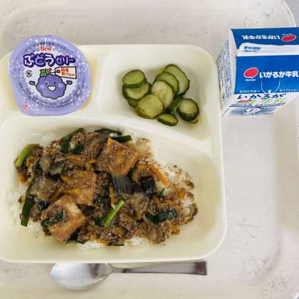 今日の献立は、牛乳、マーボー厚揚げ丼、きゅうりの中華あえ、ぶどうゼリーでした。