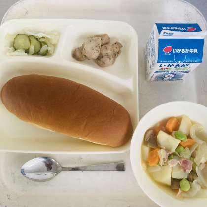 今日の献立は、黒糖パン、牛乳、鶏肉のバジル焼き、ベーコンと野菜のスープ煮、キャベツときゅうりのサラダでした。