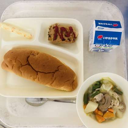 今日の献立は、おさつパン、牛乳、豆腐ローフ、洋風煮、棒チーズでした。