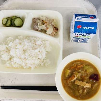 今日の献立は、ご飯、牛乳、鶏肉の塩こうじ焼き、さつまいものみそ汁、きゅうりの甘酢あえでした。
