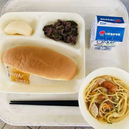 今日の献立は、コッペパン、牛乳、牛肉の香味焼き、トマトのスープスパゲッティ、梨(二十世紀)、みかんジャムでした。