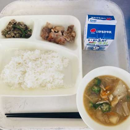 今日の献立は、ご飯、牛乳、鶏肉の照り焼き、冬瓜のみそ汁、なすのそぼろ炒めでした。