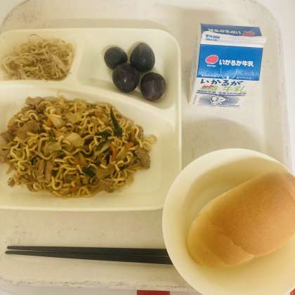 今日の献立は、ミニコッペパン、牛乳、オイスターソース焼きそば、もやしの中華あえ、ぶどうでした。