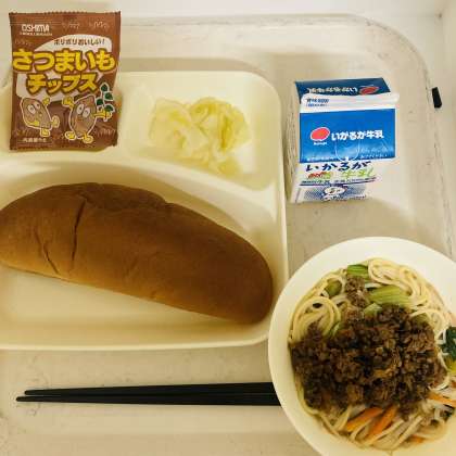 今日の献立は、黒糖パン、牛乳、タンタンめん、キャベツの甘酢づけ、おさつチップスでした。