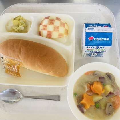 今日の献立は、コッペパン、牛乳、鶏肉とさつまいものシチュー、白菜のピクルス、りんご、みかんジャムでした。