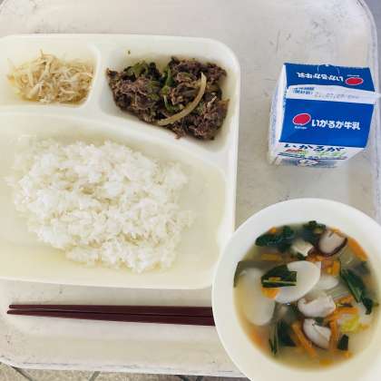 今日の献立は、ご飯、牛乳、プルコギ、トック、もやしのナムルでした。