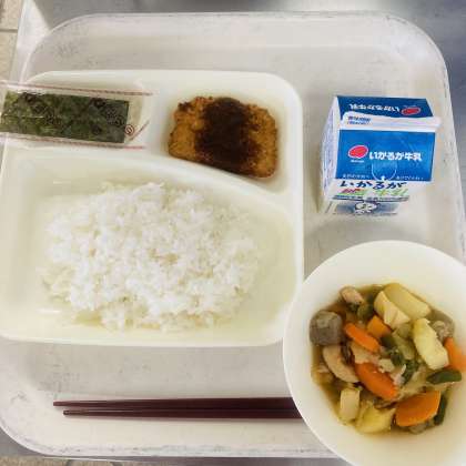今日の献立は、ご飯、牛乳、みそカツ、じゃがいもと野菜の煮もの、焼きのりでした。