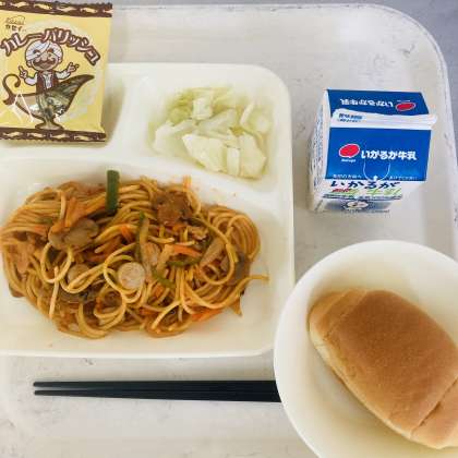 今日の献立は、ミニコッペパン、牛乳、イタリアンスパゲッティ、サワーキャベツ、カレーフィッシュでした。