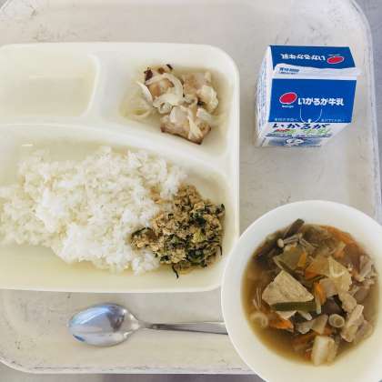 今日の献立は、ご飯、牛乳、鶏肉のゆず塩焼き、ソーキ汁、ツナ大豆そぼろでした。