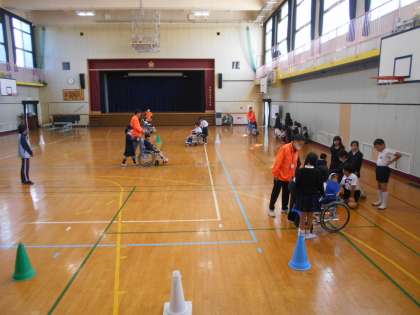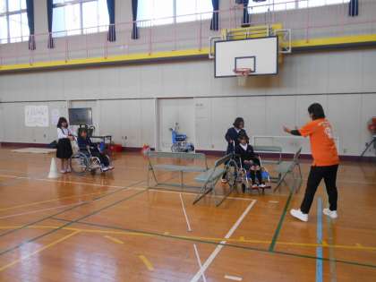 そして、3・4年生がペアになって体育館の中のコースを乗る側、押す側と両方を実際に体験しました。長椅子で作られた細い道は通行が難しいようでした。