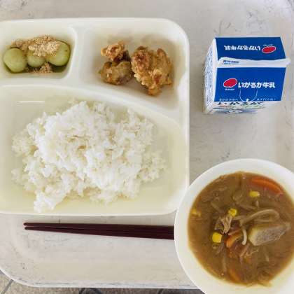 今日の献立は、ご飯、牛乳、とり天、どさんこ汁、抹茶だんごでした。
