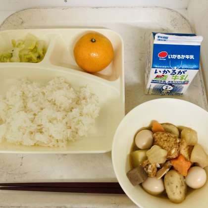 今日の献立は、ご飯、牛乳、関東煮、白菜の甘酢あえ、みかんでした。