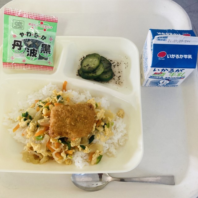 今日の献立は、牛乳、カツ丼、きゅうりの赤じそあえ、ソフト黒豆でした。