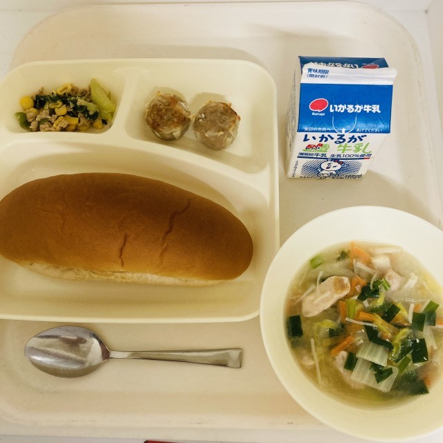 今日の献立は、黒糖パン、牛乳、焼きシューマイ、中華スープ、ツナとチンゲンサイの炒めものでした。