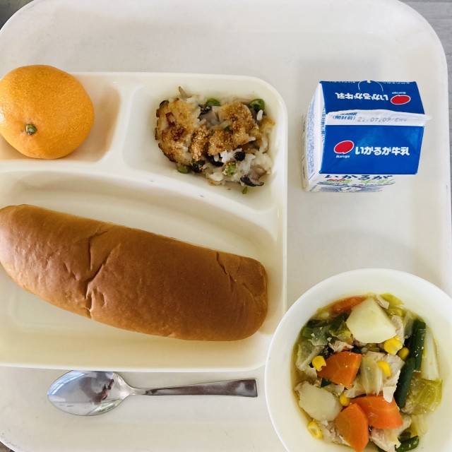 今日の献立は、黒糖パン、牛乳、きのこのドリア、鶏肉と野菜のスープ煮、みかんでした。