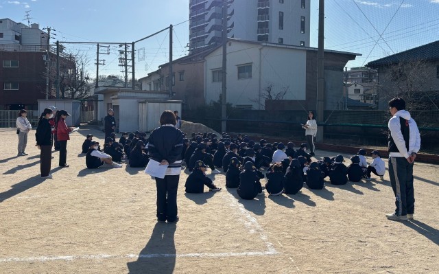 火元に近い1号階段は使用せず、2・3号階段を降りて運動場に集合しました。全児童が避難、人員確認までの時間は3分17秒でした。