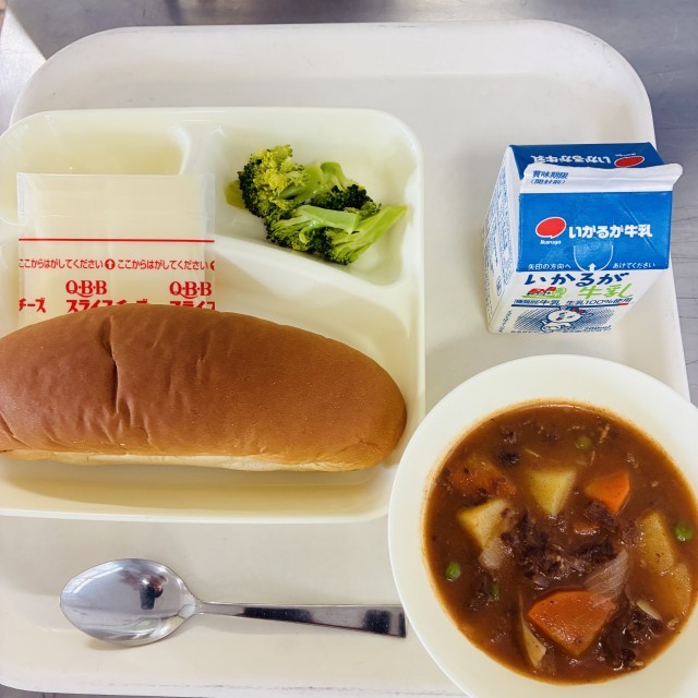 今日の献立は、黒糖パン、牛乳、ビーフシチュー、ブロッコリーのサラダ、スライスチーズでした。