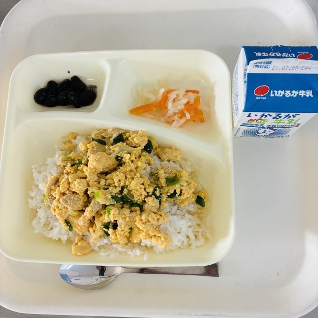 今日の献立は、牛乳、親子丼、紅白なます、黒豆の煮物でした。