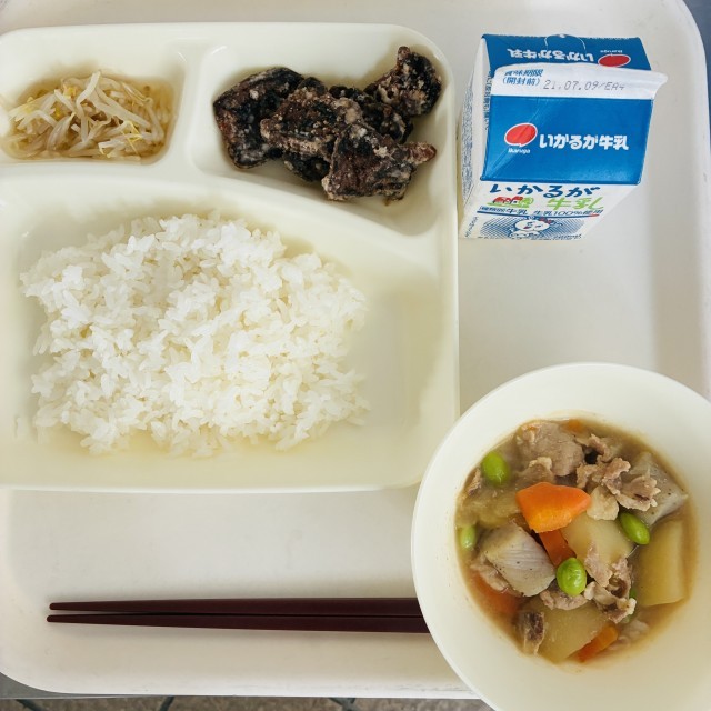 今日の献立は、ご飯、牛乳、くじらの竜田揚げ、豚肉とじゃがいもの煮物、もやしの甘酢あえでした。