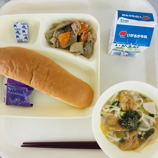 今日の献立は、コッペパン、牛乳、豚肉とごぼうの煮物、なにわうどん、固形チーズ、ブルーベリージャムでした。